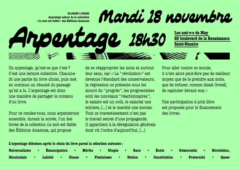 Mardi 18 novembre à 18h30 – Arpentage autour de la collection « Le mot est faible » des éditions Anamosa.